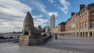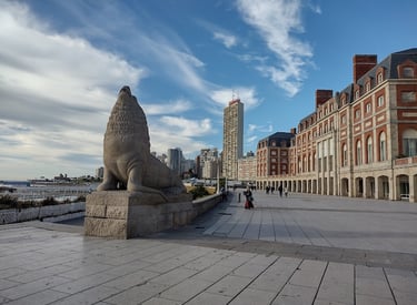 Mar del Plata: Conocida como "La Feliz", es la ciudad costera más grande. Su icónica foto es con los lobos marinos de piedra en la rambla, obra del escultor José Fioravanti. Fue pionera en el turismo de élite antes de popularizarse masivamente.