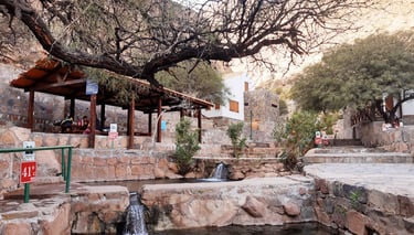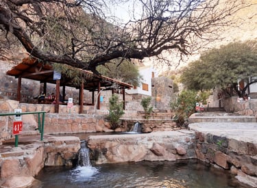 14 Piletas: El complejo cuenta con 14 piletas de piedra cordillerana que descienden en cascada, con temperaturas decrecientes desde los 51°C hasta los 28°C.